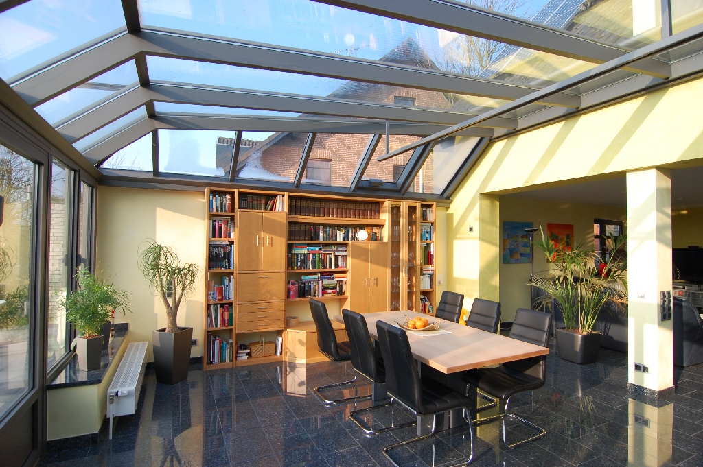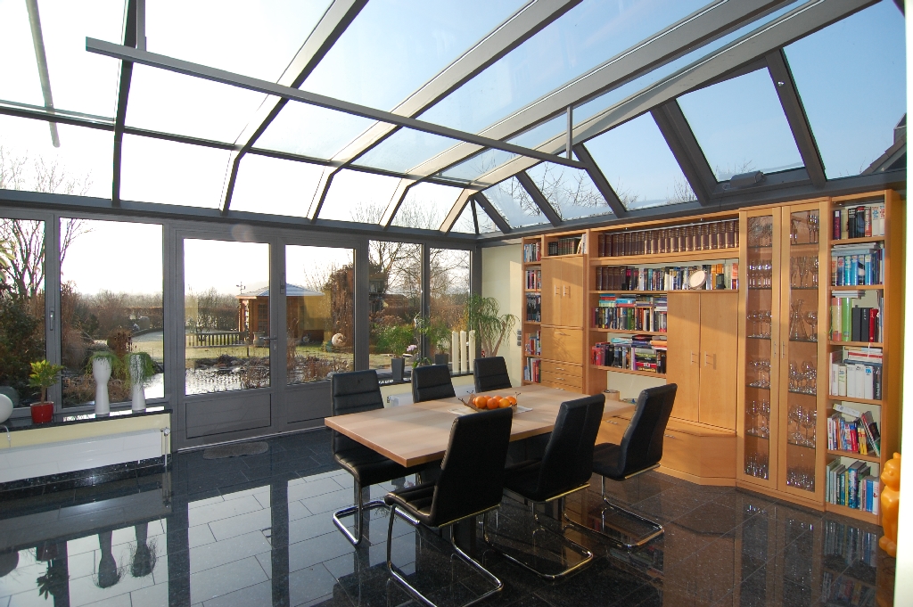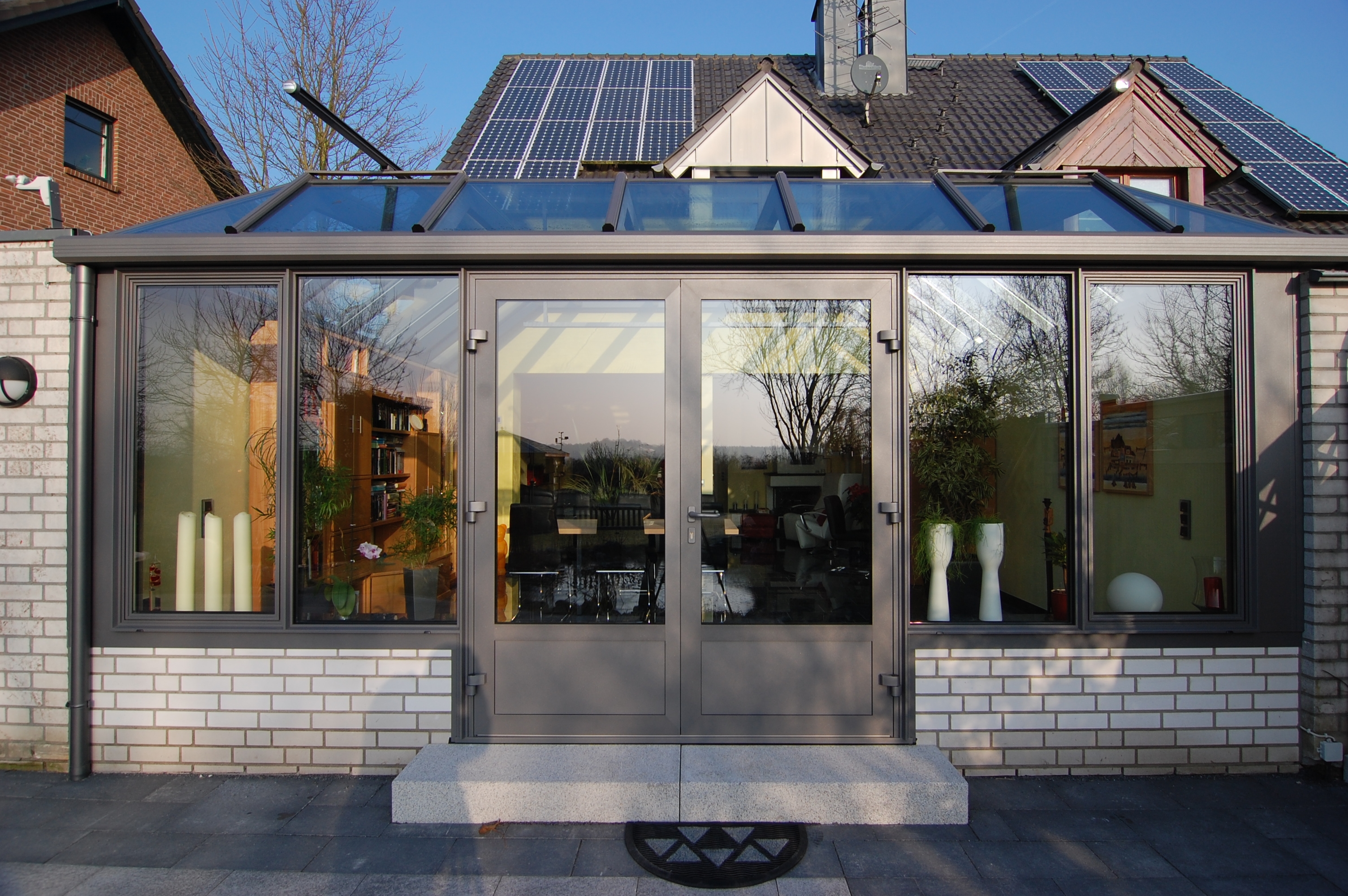 Wintergarten an der Traufenseite des Hauses angebaut, auf der linken Seite die Garage, rechts zum Nachbarn eine Brandschutzwand, die Wintergartenfarbe ist 9008ST. Das Dach ist dreiseitig abgewalmt. Weil an den seiten keine Lüftungsmöglichkeit besteht, sind im Dach auf der linken und rechten Seite je ein Dachfenster zur Belüftung eingebaut. Das Element in der Vorderseite ist aus Victorianischen Profilen gebaut. In der mitte eine doppelfügelige Türe, außen je ein Drehkippfenster. Die Fenster zum Wohnhaus wurden entfernt, so das ein großer, lichtdurchfluteter Raum entstand.