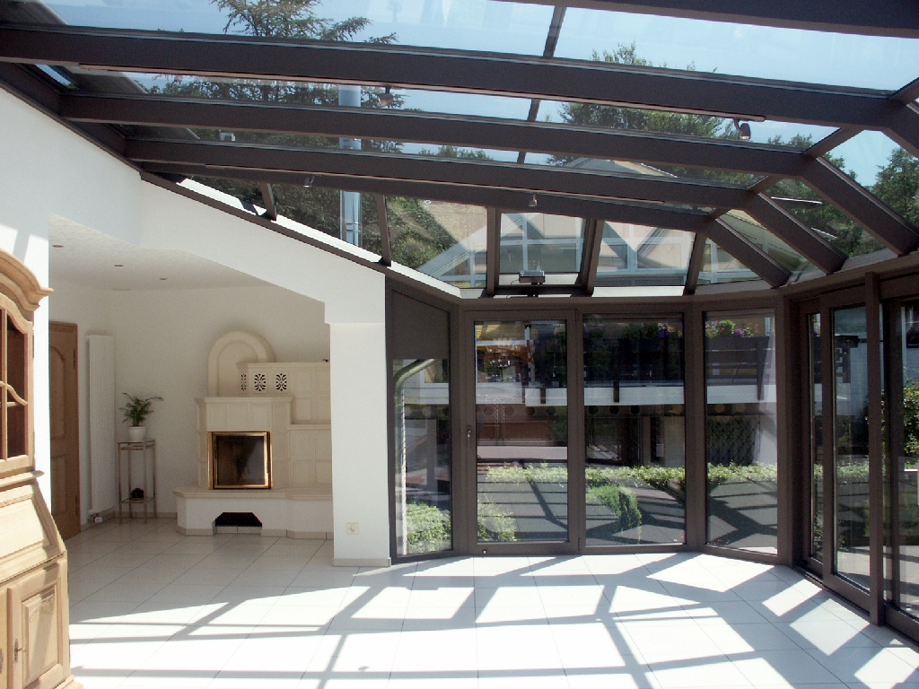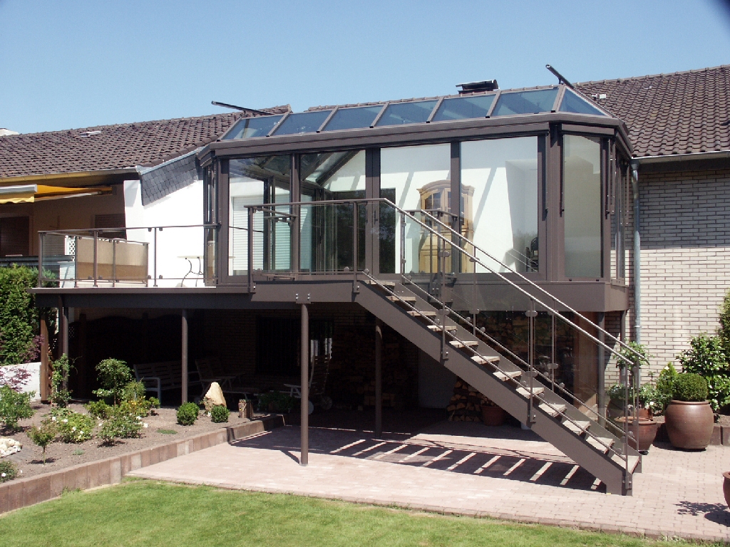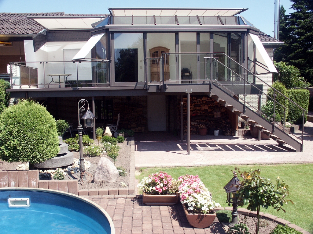 Wintergarten in 8014ST. Für den Wintergarten wurde eine Stahlkonstruktion als “Boden” gebaut. Wegen schwieriger Bodenverhältnisse mussten die Fundamente für die Stahlstützen 2,5m im Boden eingelassen werden. Der unterm Wintergarten entstandene “Raum” dient als Holzlager für den Kamin und Abstellfläche für die Gartenmöbel. Alle Glasflächen haben eine Beschattung. Zur Terrassenseite eine 2tlg Hebeschiebeanlage, zur Vorderseite eine 4 tlg Hebeschiebeanlage. Auf der rechten Seite festverglaste Elemente und ein Drehkippfenster. Im seitlich abegewalmten Teil des Daches je ein Dachfenster, um eine optimale Belüftung zu gewährleisten. Die Treppe ist aus Stahl, verzinkt und 8014ST pulverbeschichtet. Das Geländer aus Aluminium mit Ein- scheibensicherheitsglas (ESG). Der Wintergarten wurde von uns inkl. der Stahlkonstruktion, Geländer und Markisen gefertigt und geliefert.