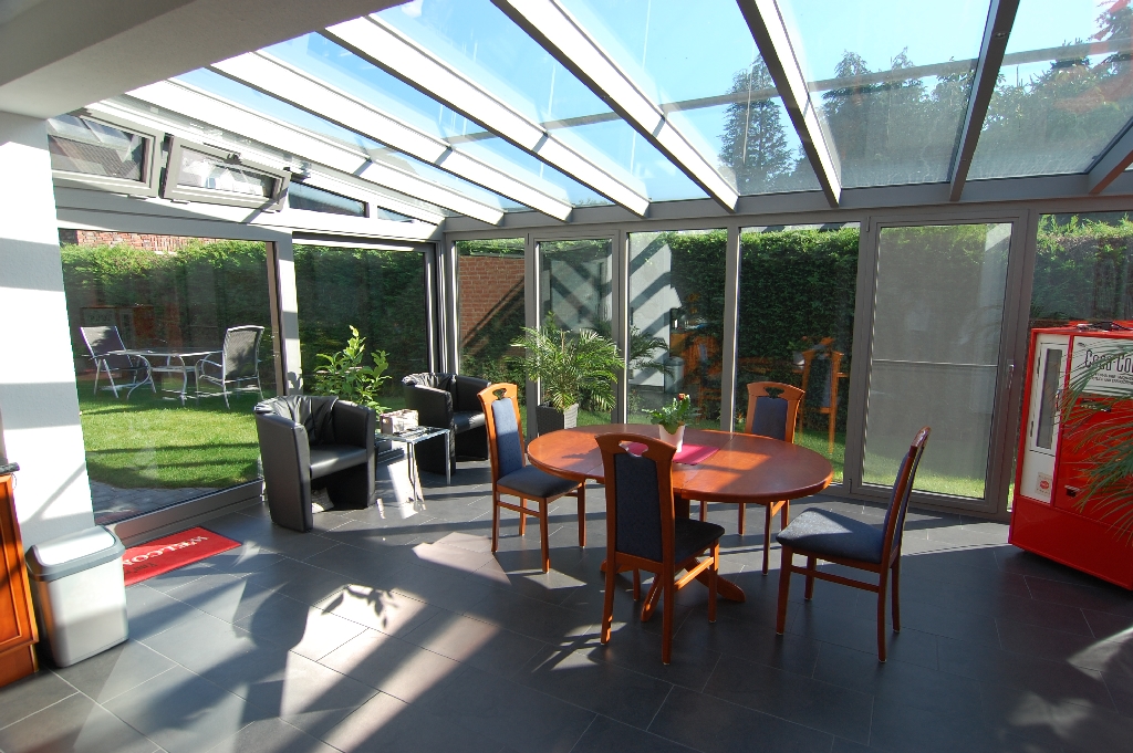 Wintergarten in 9007ST an der Giebelseite des Wohnhauses an- gebaut. An dieser Stelle stand vorher ein Erker im Massivbauweise. Durch den Wintergarten wurde das Wohnzimmer zu einem transparenten Wohnraum in den Garten erweitert. Wintergarten mit Markise und Fliegenschutz, zum Garten drei feste Glaselemente und zwei Drehkippfenster, zur Terrasse eine Hebeschiebetüre, darüber zwei Kippoberlichter.