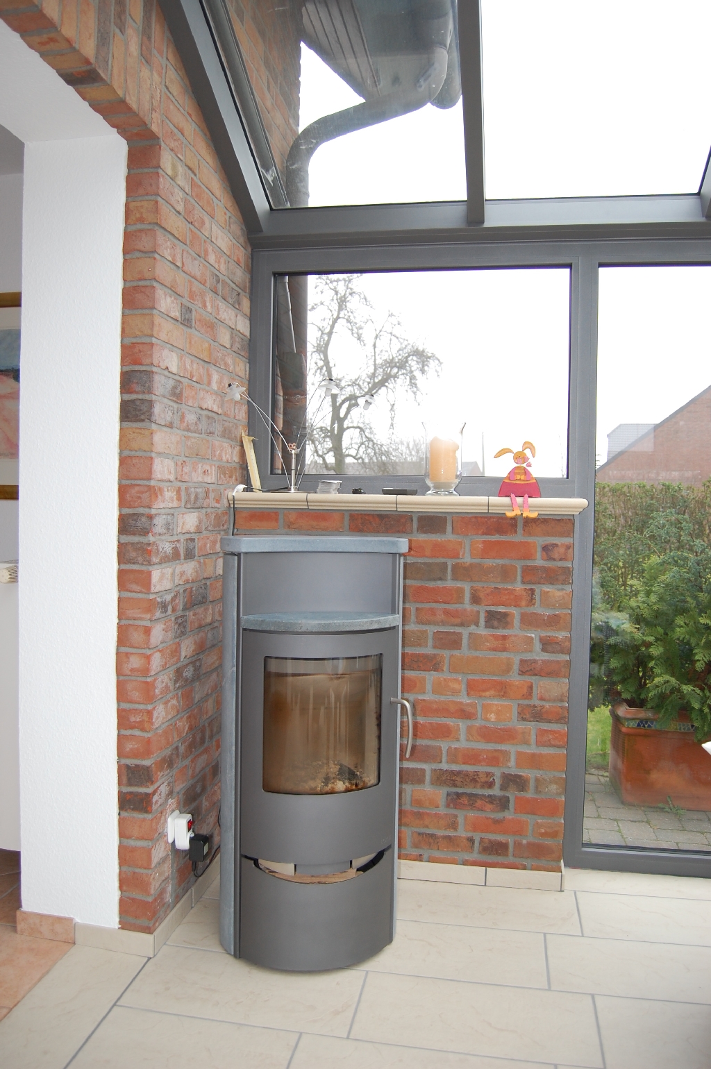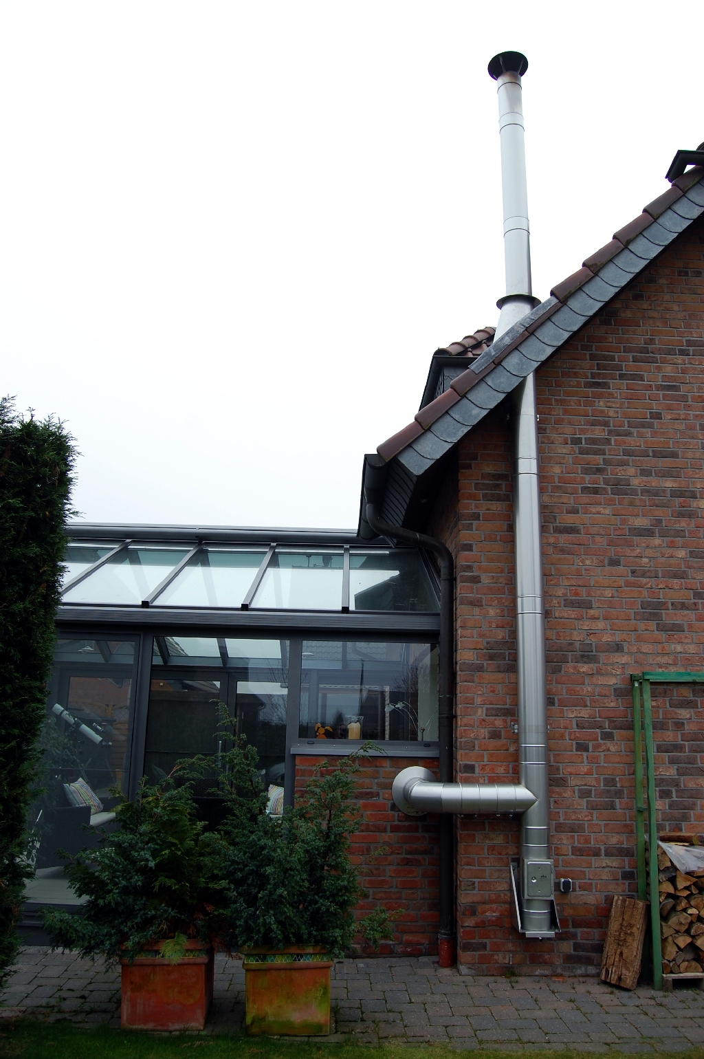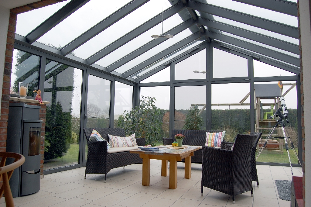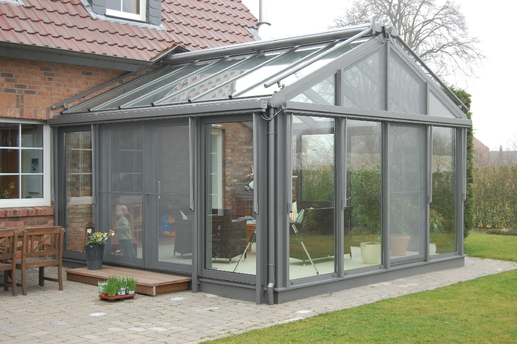 Wintergarten an der Traufenseite des Hauses angebaut, Farbe 9008ST. Um eine ausreichende Höhe zu erreichen, wurde der Dachüberstand im Bereich des Giebels eingekürzt. Das Element zum Wohnzimmer wurde komplett entfernt, so das ein großer, lichtdurchfluteter Raum, entstand. Beide Dachflächen sind mit einer Markilux Markise beschattet. Die senkrechten Elemente Richtung Süden und Südwesten sind mit einer Markilux Fallarm- kassettenmarkise beschattet. In der rechten Seite wurde eine kleine Mauer intergriert, um dort einen Kamin aufzustellen. Das Kaminrohr gelangt durch diese Mauer nach außen und wird an Hauswand nach oben geführt. Auf der rechten Seite ein Drehkippfenster, in der Giebelseite ein Kippflügel und zwei Kippoberlichter, die mit einem Motor geöffnet werden. Auf der linken Seite zur Terrasse eine 4tlg Hebeschiebeanlage.