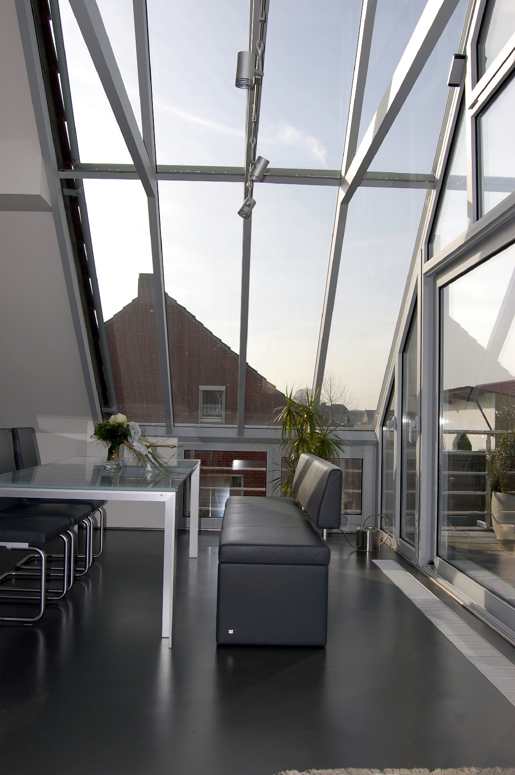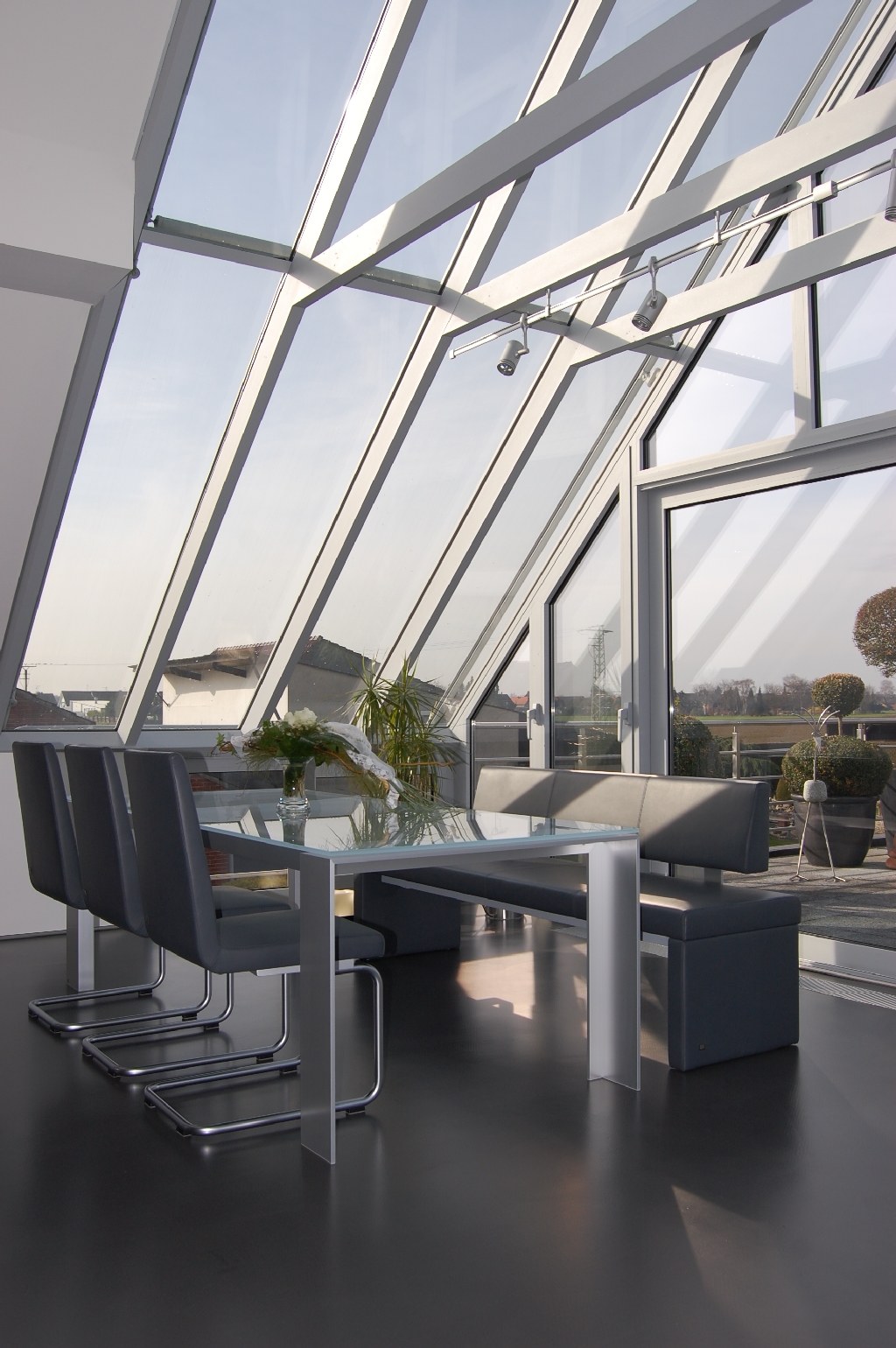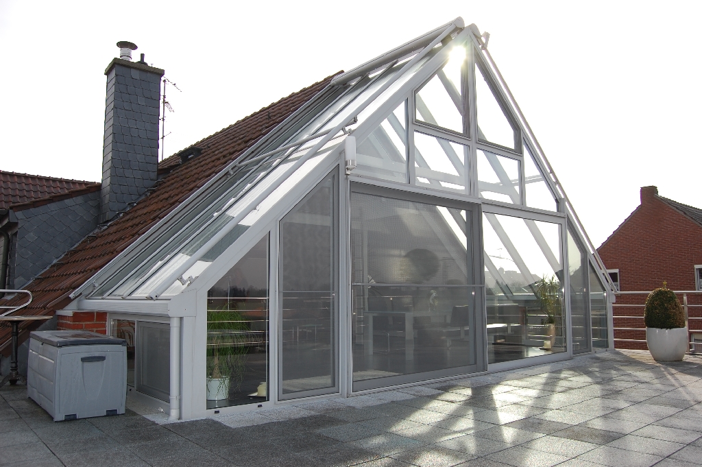 Wintergarten in 9006ST auf der Dachterrasse erstellt. Der Wintergarten ist als transparente Verlängerung des Hausdaches gebaut worden. In den kleine Seitenelementen rechts und links je ein Kippflügel, in der Geibelseite zwei Kippflügel und zwei Kippoberlichter die mit einem Motor geöffnet werden, als Zugang zur Dachterrasse eine 2tlg Hebeschiebeanlage. Die Dachflächen sind mit einer Markilux Markise beschattet. Alle Öffnungen sind mit einem Insektengitter ausgestattet.