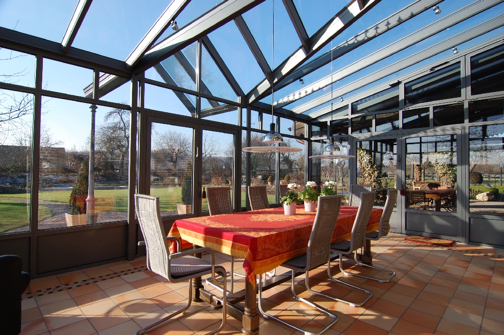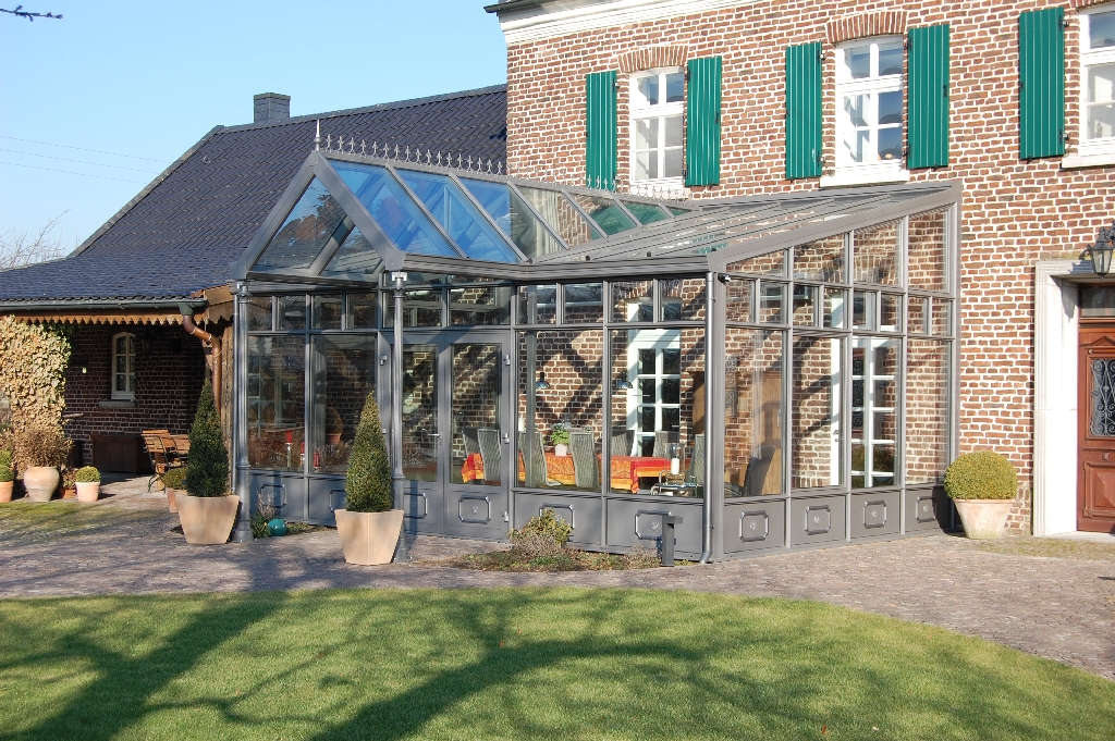 Ein Beispiel vom passenden Gebäude und Wintergarten sehen Sie auf den Fotos links. Der Wintergarten wurde in Verlängerung der vorhandenen Überdachung gebaut. Der Einschuss im Dach ist über der doppelflügeligen Eingangstüre verlängert, so dass dort eine Überdachung entstanden ist. Die linke Seite hat als Durchgang zum Hausdach eine doppelflügelige Türe und zwei trapezförmige Kippoberlichter. Zur rechten Seie oberhalb der Brüstung ein Kippoberlicht und im Ausgleichsdreieck wieder zwei Kippflügel, die alle mit einem Motor bedient werden. Untern eine umlaufende Brüstung aus isolierten Alupanelen und einen Zierrahmen. Unterhalb der Traufe ein umlaufendes Oberlichtband welches gegenüber den anderen Elementen noch eine zusätzliche Unterteilung hat.